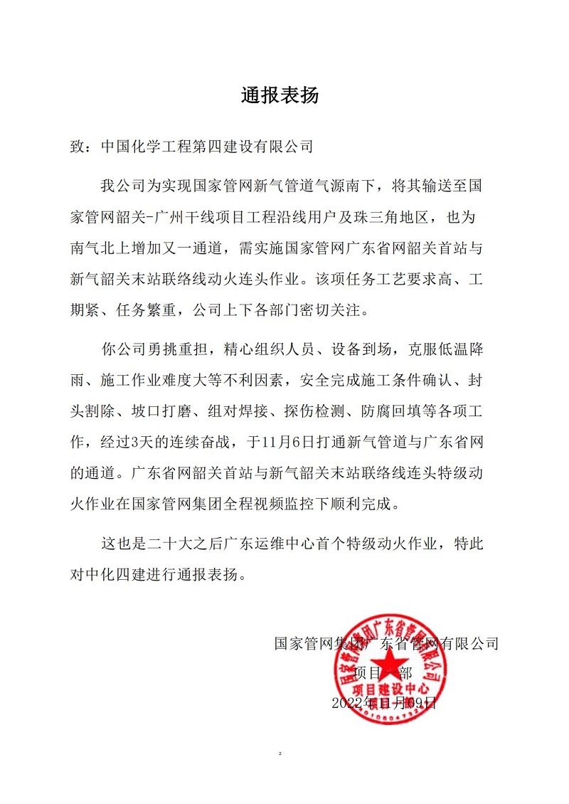 信中指出,東北公司承建的國家管網(wǎng)韶關(guān)-廣州干線項目在面對工程工藝要求高、工期緊、任務(wù)重、施工現(xiàn)場作業(yè)難度大等多重困難的情況下,項目團隊精心策劃、科學(xué)組織、統(tǒng)籌安排,克服各種不利因素,圓滿完成了廣東省網(wǎng)韶關(guān)首站與新氣韶關(guān)末站聯(lián)絡(luò)線連頭特級動火作業(yè)。此次新氣管道與廣東省網(wǎng)通道的打通,是國家管網(wǎng)新氣管道氣源南下的一個重要節(jié)點,也是黨的二十大勝利召開之后,在國家管網(wǎng)集團的全程視頻監(jiān)控下,廣東省運維中心完成的首個特級動火作業(yè),特向公司項目團隊的辛勤付出進(jìn)行通報表揚。