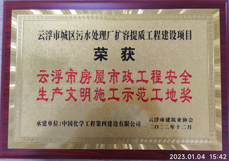 1月4日,由華南公司承建的云浮市城區(qū)污水處理廠擴(kuò)容提質(zhì)工程項(xiàng)目獲評(píng)2022年云浮市房屋市政工程安全生產(chǎn)文明施工示范工地。