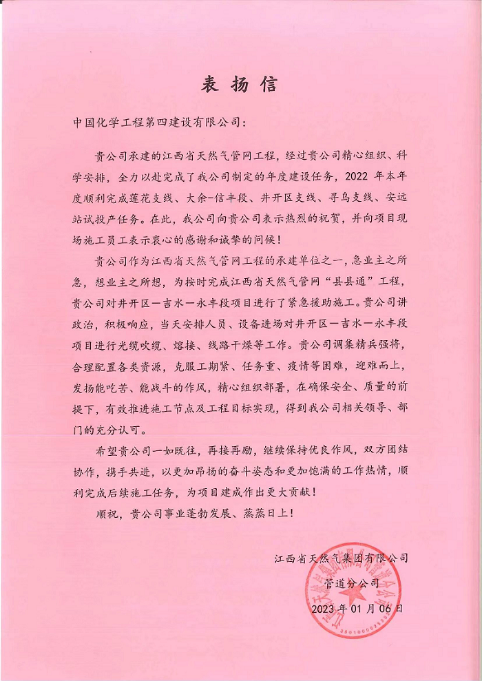 元月7日,江西省天然氣集團(tuán)有限公司管道分公司給華北公司發(fā)來表揚(yáng)信,對(duì)華北公司安全優(yōu)質(zhì)高效完成江西省天然氣管網(wǎng)工程年度建設(shè)任務(wù)表示感謝。