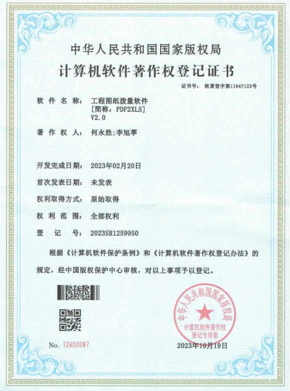 近日,公司取得由國(guó)家版權(quán)局頒發(fā)的《工程圖紙撥量軟件》著作權(quán)登記證書。這是公司繼《企業(yè)短信群發(fā)系統(tǒng)》《企業(yè)外經(jīng)證業(yè)務(wù)管理系統(tǒng)》后獲得的第3項(xiàng)計(jì)算機(jī)軟件著作權(quán)登記證書。