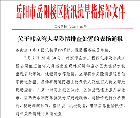 7月5日,岳陽市委常委、常務(wù)副市長李建華到項目現(xiàn)場督導(dǎo)防汛工作,對公司前段防汛工作給予充分肯定。同日,岳陽市岳陽樓區(qū)防汛抗旱指揮部發(fā)來通報,對項目部精心組織、及時處置,確保管涌險情得到有效控制予以表揚(yáng),并對喻希陽予以嘉獎。