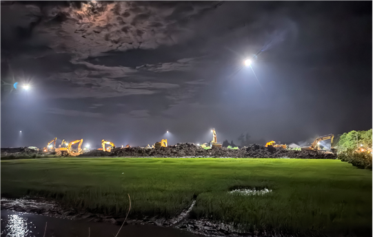 因第三道防線地處岳陽市君山區(qū)良心堡鎮(zhèn)一個小村落,基礎(chǔ)設(shè)施極不完善,施工面臨村內(nèi)稻田、水塘、溝渠縱橫,高壓線、照明線架設(shè)高度不夠,搶建期間社會車輛、搶險車輛密集通行,土方石方須遠(yuǎn)距離運(yùn)輸?shù)痊F(xiàn)實(shí)困難,公司不等不靠,多方協(xié)調(diào)、創(chuàng)新方法,有效克服了大型機(jī)械進(jìn)場難、場內(nèi)交通組織難、土方石方調(diào)配難、安全管理執(zhí)行難等難以想象的困難,比預(yù)期提前8個小時實(shí)現(xiàn)堤壩合龍。