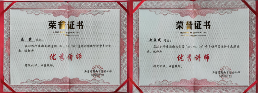 近日,共青團(tuán)湖南省委召開“理 XIANG 青年”新時(shí)代湖湘青年理論學(xué)習(xí)年度示范宣講會(huì)。會(huì)上,公司青年盛莉、趙佳成榮獲“湖南省2024年度優(yōu)秀講師”稱號。
