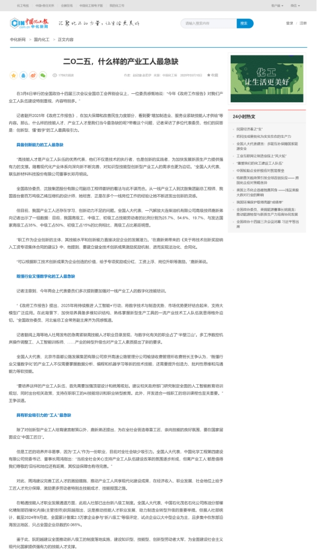 3月10日,中化新網以《二O二五,什么樣的產業(yè)工人最急缺》為題報道周鴻的建議。