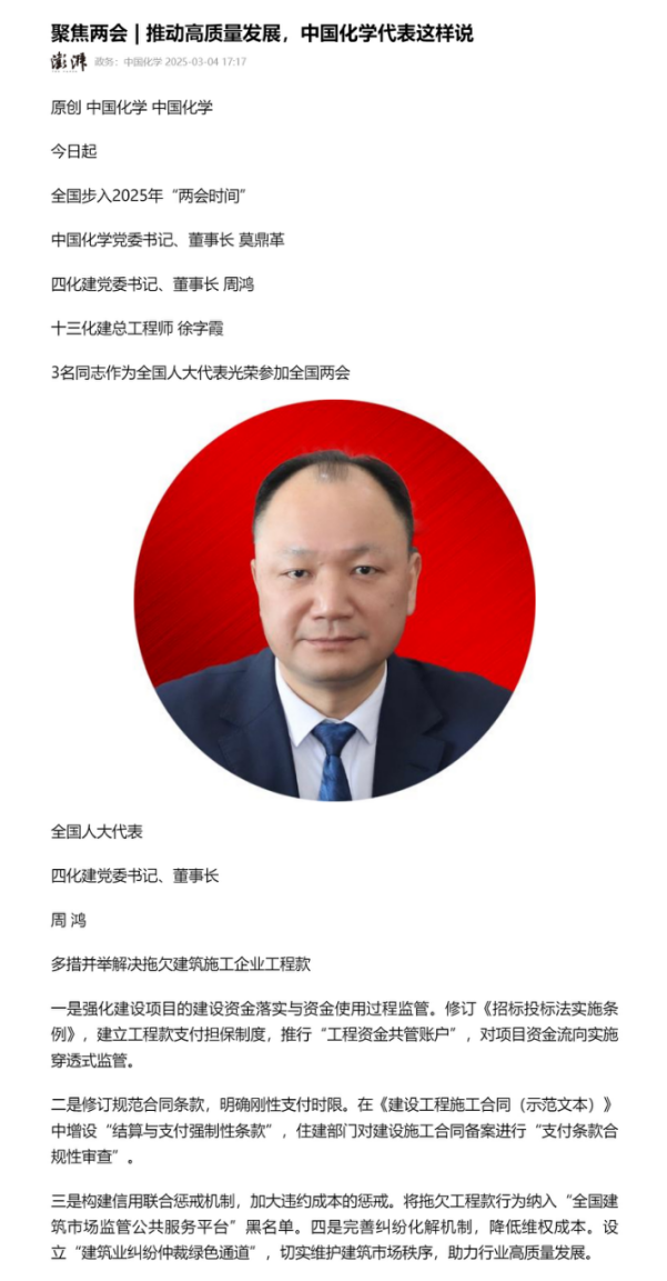 2025年全國兩會期間,全國人大代表,中國化學四化建黨委書記、董事長周鴻向大會提交《關于加強產業(yè)工人隊伍建設的建議》《關于多措并舉解決拖欠建筑施工企業(yè)工程款的建議》《關于推動洞庭湖區(qū)常岳九鐵路、荊岳鐵路、監(jiān)利至華容至益陽鐵路規(guī)劃建設提速的建議》《關于修改最高法院〈關于大型企業(yè)與中小企業(yè)約定以第三方支付款項為付款前提條款效力問題的批復〉的建議》等4條建議,受到主流媒體深入報道,引起社會各界廣泛關注。