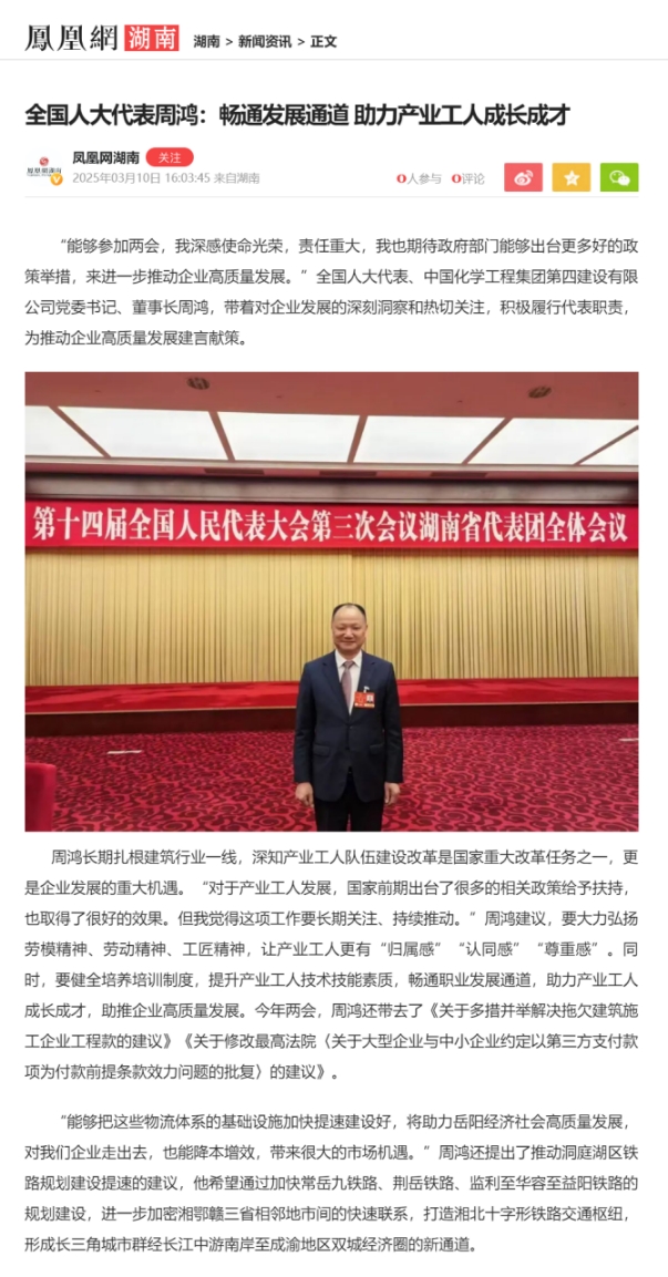 3月10日,鳳凰網湖南頻道以“全國人大代表周鴻:暢通發(fā)展通道 助力產業(yè)工人成長成才”為題報道周鴻參加2025年全國兩會。