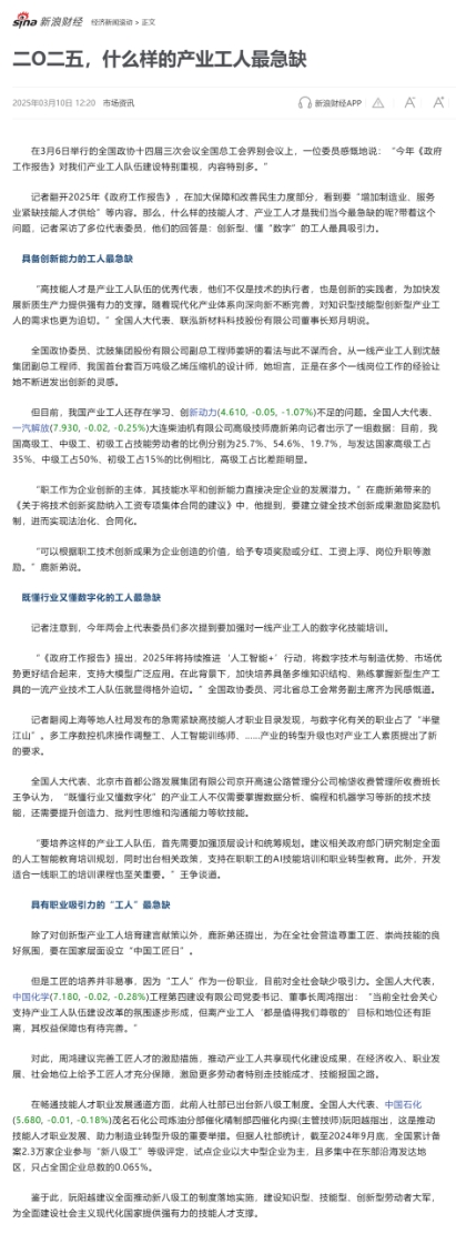 3月10日,新浪網以《二O二五,什么樣的產業(yè)工人最急缺》為題報道周鴻的建議。