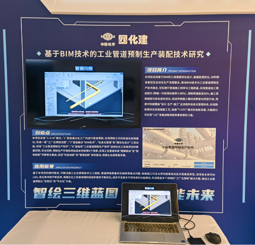 會(huì)議期間,舉行了中國(guó)化學(xué)首屆青年創(chuàng)新創(chuàng)效展,公司青年創(chuàng)新創(chuàng)效項(xiàng)目——基于BIM技術(shù)的工業(yè)管道預(yù)制生產(chǎn)裝配技術(shù)研究項(xiàng)目亮相展會(huì),通過(guò)視頻、圖文及展板講解等多種形式,全方位展示了項(xiàng)目成果。該項(xiàng)目通過(guò)“1+3+N”模式推動(dòng)施工數(shù)字化轉(zhuǎn)型,預(yù)制率提升至60%,為傳統(tǒng)施工模式注入數(shù)智化動(dòng)力。
