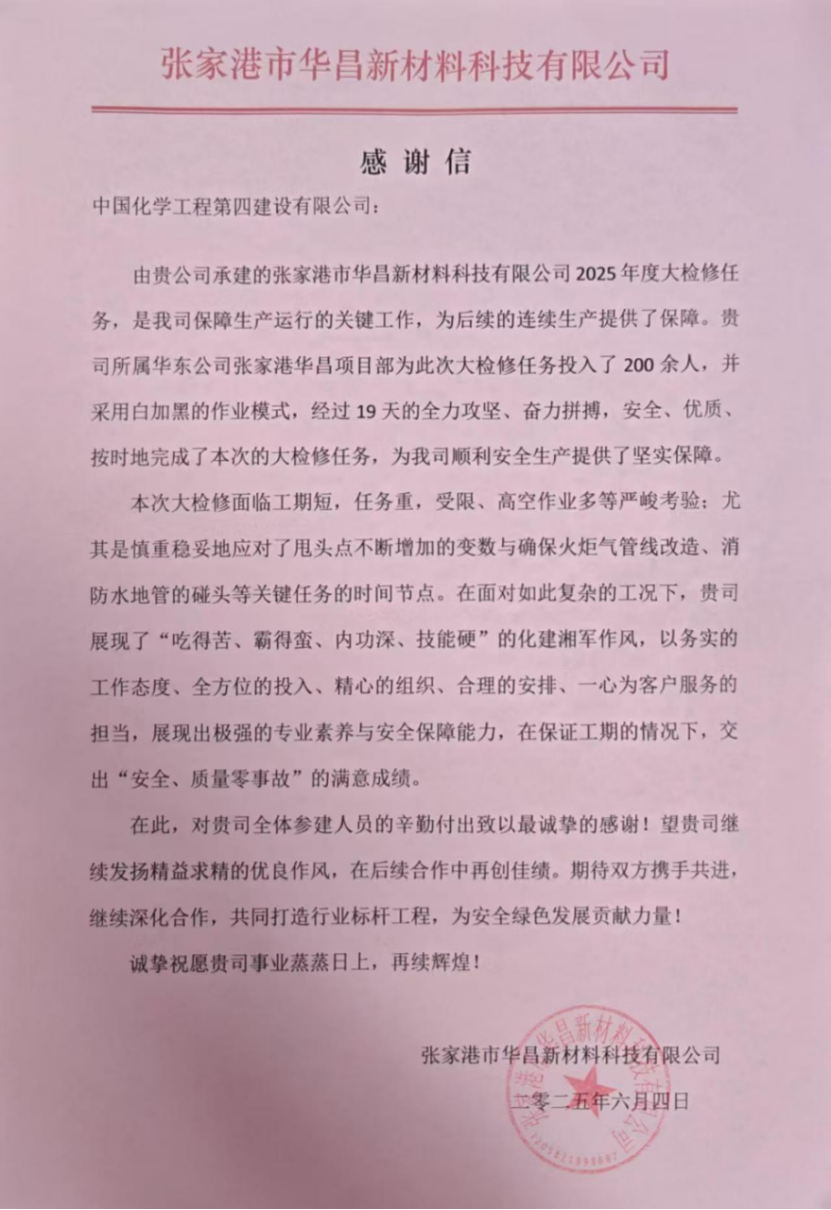 近日,江蘇華昌新材料科技有限公司向公司發(fā)來感謝信,對華東公司在張家港華昌2025年度零星維修及技改技措項(xiàng)目大檢修中的突出表現(xiàn)給予高度贊揚(yáng)和衷心感謝。