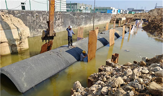 該雨水管道施工區(qū)域位于水下,管中線離海水僅有20米并與海相通,管道安裝難度大;同時,在開挖過程中,取水箱涵上面出現(xiàn)大量海水涌入導(dǎo)致土層坍塌。面對緊急情況,項目部連夜探討解決管道水中定位與對接問題,積極會商業(yè)主、監(jiān)理單位,積極探索解決問題的路徑和方法,最后決定因“水”制宜,采取水下澆注混凝土來解決此難點。施工人員在箱涵上方處,通過對預(yù)應(yīng)力鋼筒混凝土管兩端頭進行預(yù)制管枕施工,淤泥層及碎石處采取預(yù)制閥板墊層,挖集水坑進行強排,并且全程用GPS和全站儀進行精確測量標(biāo)高和定位,確保雨水管道安裝的準(zhǔn)確性和穩(wěn)定性,順利完成管道水中施工作業(yè)。